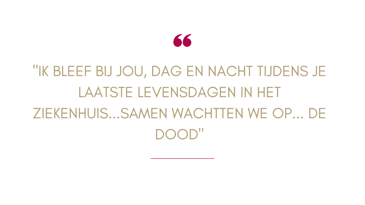 Ik weet hoe het voelt, mijn man zaliger stelde me al die vragen tijdens zijn laatste levensjaar. Hij, de rationele, intellectuele man die tijdens het leven dergelijke filosofische vragen afweerde omdat hij het antwoord niet kende, niet wilde dat de dood bestond. Ik vergeet nooit hoe hij mij de kleren van mijn lijf vroeg die laatste dagen in het ziekenhuis. Hij wilde een antwoord, een antwoord dat hem met angstig zou maken voor het onbekende, de onbekende, laatste reis die hij zou maken.