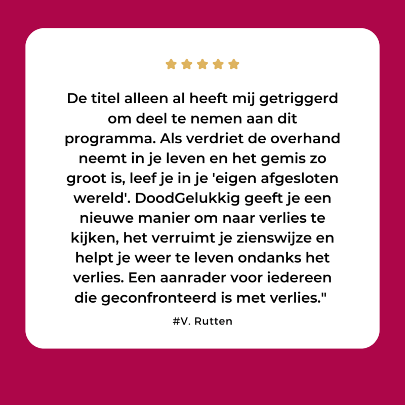 DoodGelukkig traject is helemaal gebaseerd op Wim zijn vragen. DoodGelukkige getuigenissen is er om aan te tonen dat ik niet alleen sta in mijn andere kijk op de dood. 27 mensen met een uiteenlopende beleving van de dood vertellen hun levensverhaal. Hoe ze er in slagen om toch gelukkig verder te leven zonder hun geliefde in dit leven. Zonder hun geliefde verder moeten in dit leven maar zich eeuwig verbonden voelen door hun ziel.
